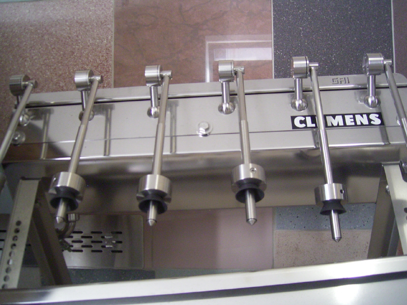 Der Flaschenfüller mit 6 Füllorgane für Flaschen von 0,33 bis 3,0 Liter. Mit diesem Füller werden drucklos die Flaschen gefüllt. Anschließend erfolgt die Flaschengärung und -reifung.